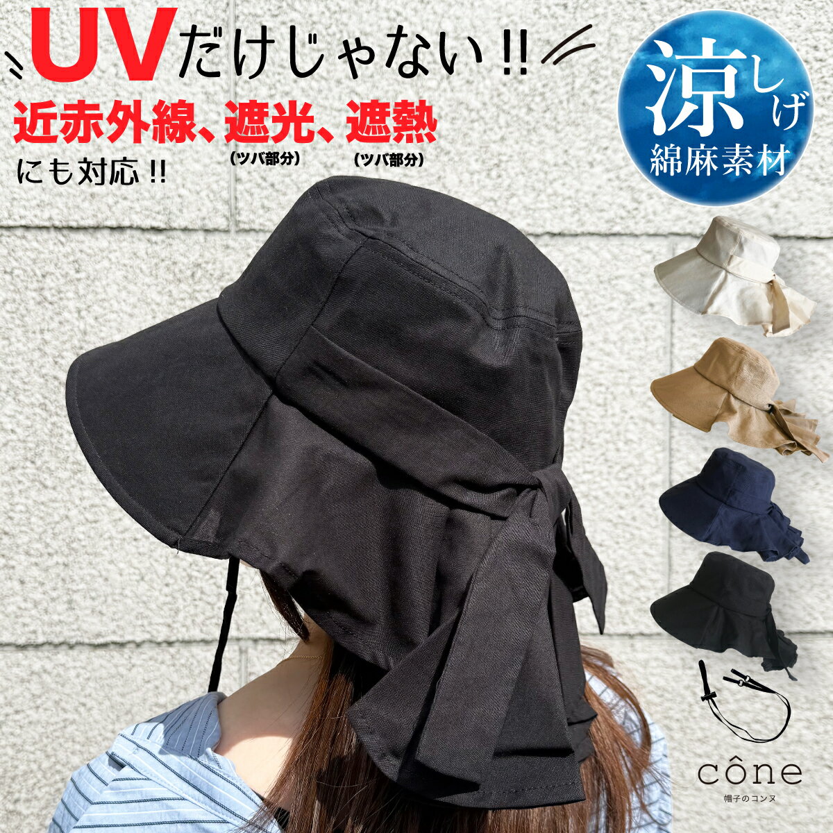 【クーポンで40%オフ】帽子 レディース UVカット【綿麻タレ付】つば広 折り...
