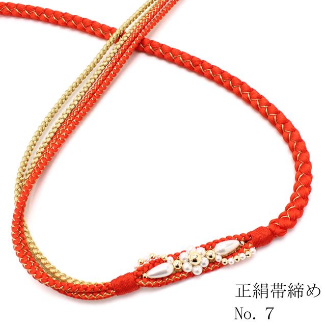 商品説明 正絹手組み帯締めです 絹のしなやかで張りのある糸を使用し1本1本丹念に組上げた帯締めです。 飾り部分のフェイクパールが豪華さを演出します。 片方の端が細く分かれてますので変わり結びもできます。 絹糸ですので締りが良くきっちりと締めることが出来ます。 <カラー>10色 赤・緑・水色・ピンク・ピンクパ...