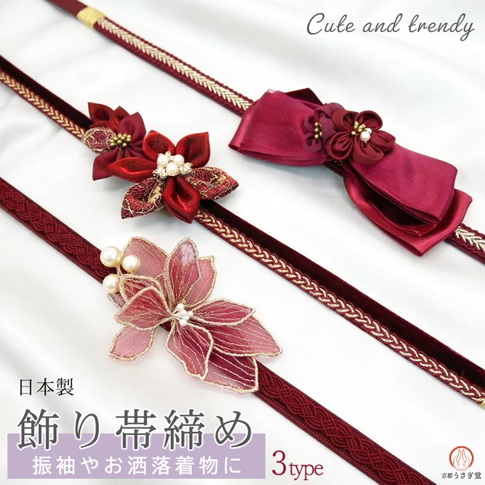 <おすすめポイント> 絹100%の平組の帯締めに、リボンやつまみ細工、オーガンジーの花飾りが装飾された、可愛らしくて豪華な帯締めです。 正絹の帯締めはしなやかな手触りと絹の特有のハリがあり、しっかりと締めて頂けます それぞれの飾り部分はパールビーズや金糸の刺繍などもされており、モダンでお洒落なデザインで...