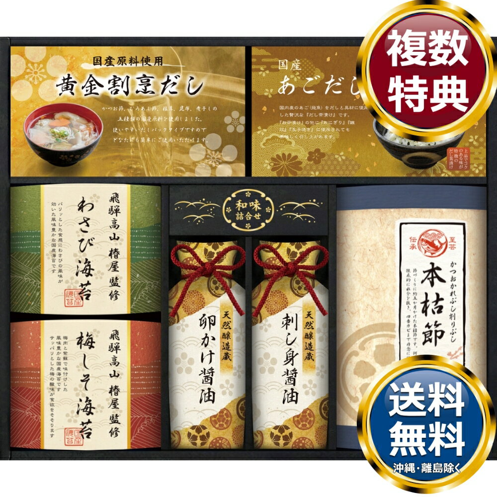 商品説明飛騨高山の和食の名店「椿屋」が2種類の味付け海苔を監修しました。天然醸造のお醤油などと一緒に、もらってうれしい和の詰合せです。 商品情報商品内容飛騨高山椿屋監修(わさび海苔(8切6枚)×1、梅しそ海苔(8切6枚)×1)、黄金割烹だしパック(8g×2)×1、国産あごだし茶漬け(5g×2)×1、本枯れ鰹節2g×4...
