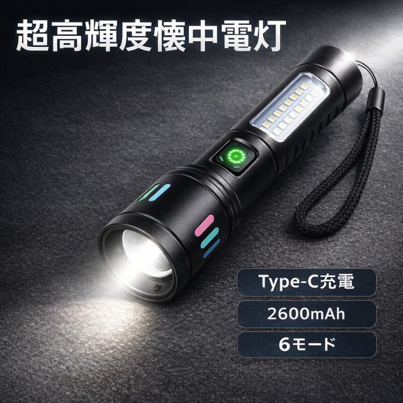 2025年最新強化版 LED懐中電灯|2600mAh大容量・Type-C充電・6モード・500m照射 停電・防災・キャンプ・登山・夜釣り・作業用に最適/軍用級アルミ合金・生活防水・耐衝撃 🌟 商品特徴 高輝度:最大800ルーメン/最長500mロングビーム 2600mAh大容量&長時間:最長16時間の連続使用に対応(※モードによる) USB T...