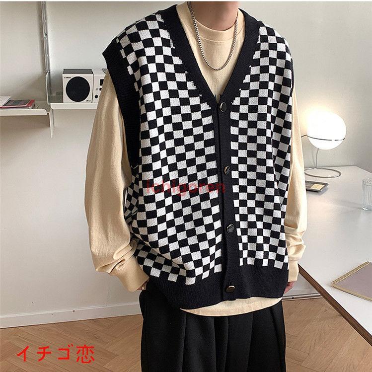 メンズベスト ニットベスト ノースリーブ ニットセーター チェック柄 カジュ...