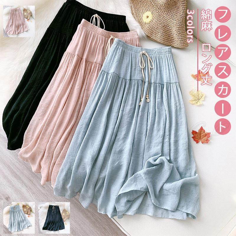 フレアスカート レディース Aライン 無地 綿麻 ロング丈 ボトムス カジュア...