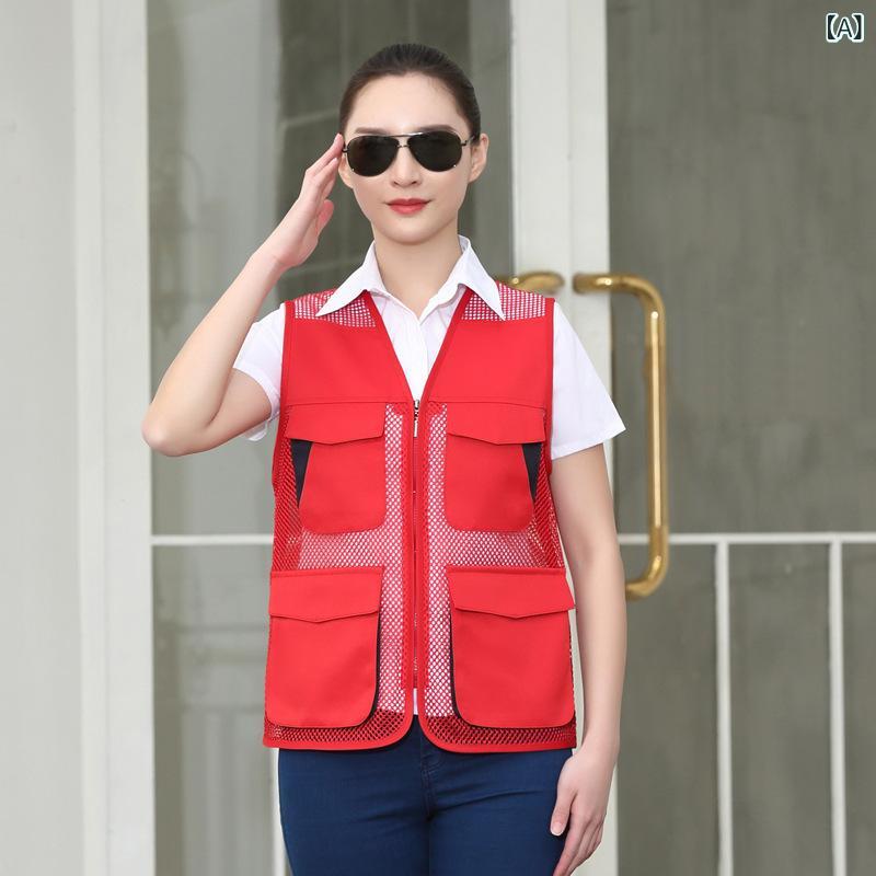 ベスト 男性用 作業着 メッシュ 通気性 ポリエステル 赤 レッド グレー グレ...