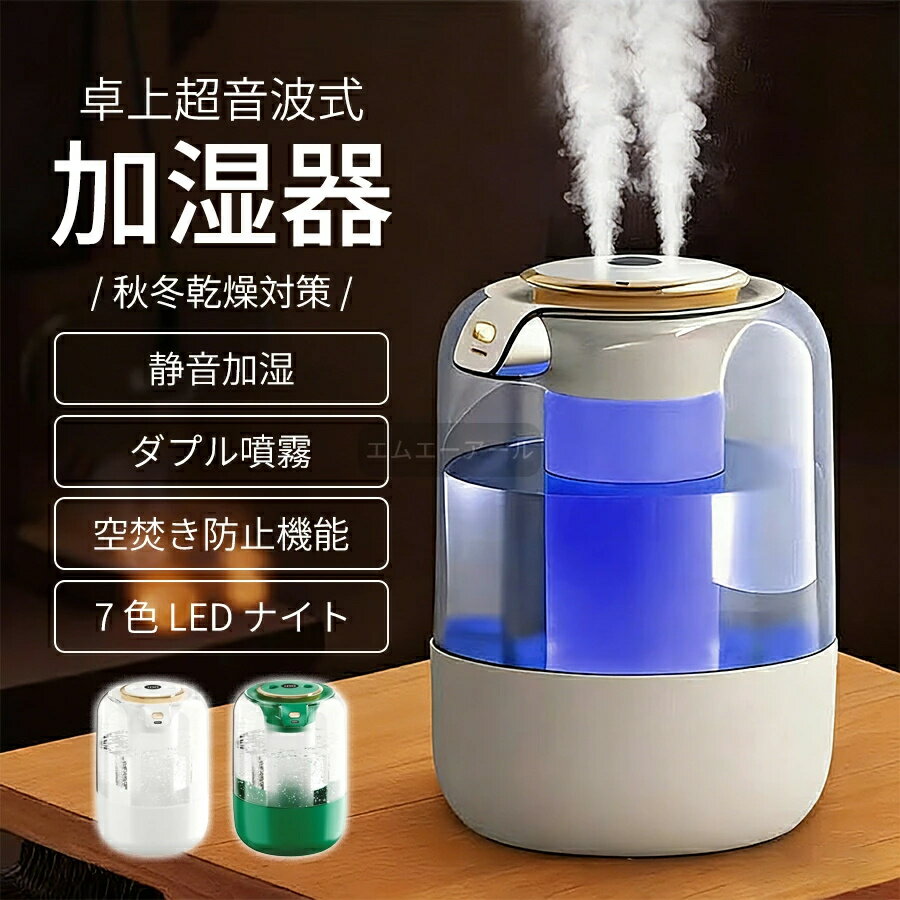 加湿器 デュアルノズルスマート加湿器除菌加湿・2倍の霧量停電保護機能カラ...