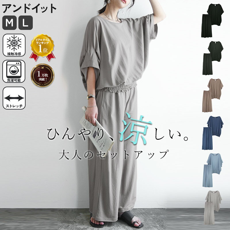 【検索キーワード】セットアップ レディース カジュアル 夏 オールインワン レディース 上下セット トップス ボトムス プルオーバー ワイドパンツ レディース 春夏 涼しい 接触冷感 ひんやり ひんやり素材 涼感 cool クール 半袖 ウエストゴム シャーリング ゆったり リラックス ワンマイル ラフ カジュアル 楽ちん 新カ...