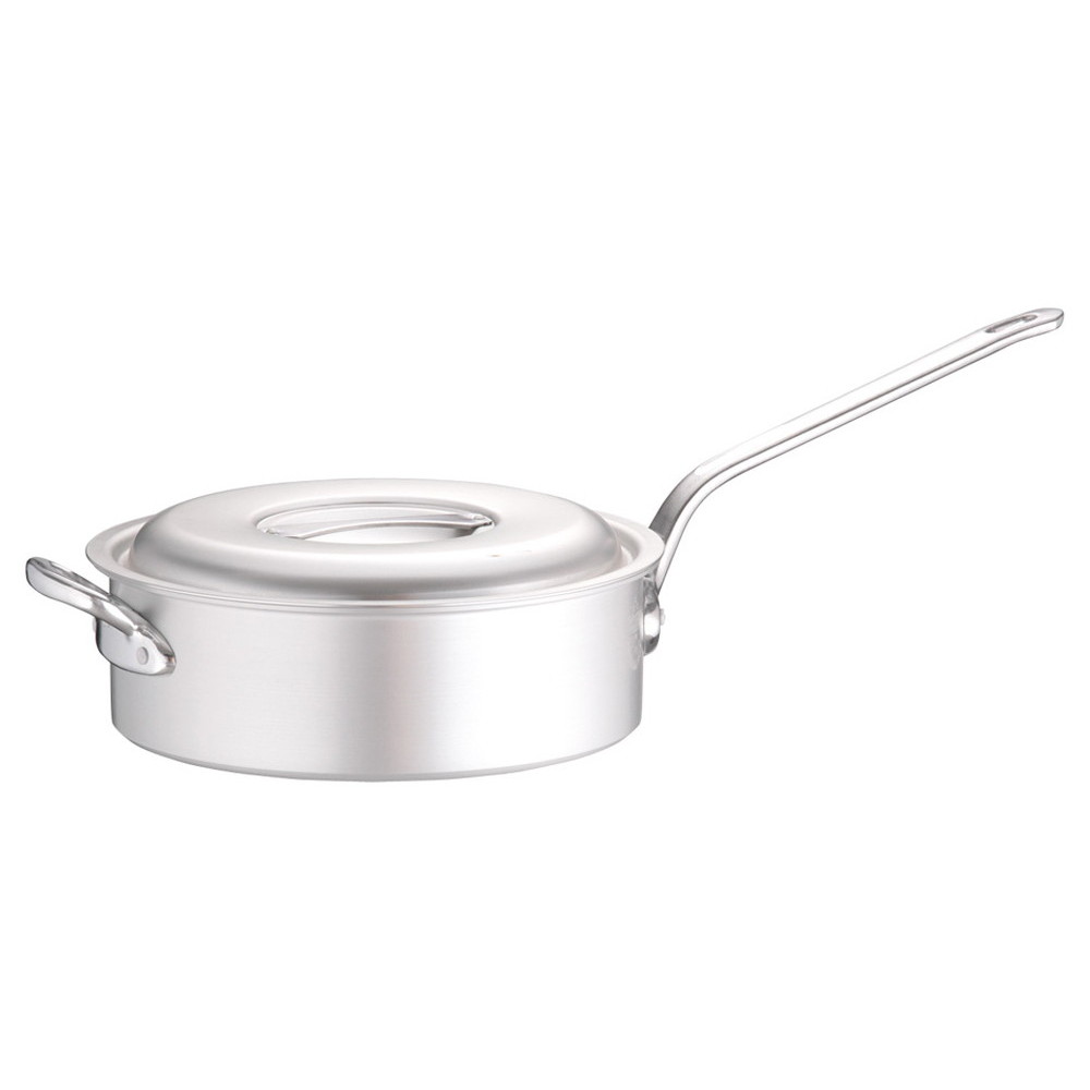 [商品名] アルミ マイスター片手浅型鍋 33cm [素材] アルミニウム合金[寸法] 外径:361mm 深さ:110mm 約9.5L 質量:3kg 板厚:4mm[産地]日本向かい手付き 商品によっては手造りのため、写真と色・かたちが若干異なることがございます。使いやすさと確かな品質で味の業に応えるマイスターシリーズ・全面にアルマイト加工...