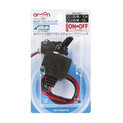 【返品種別A】□「返品種別」について詳しくはこちら□◆本体がコードまで防水保護されたトグルスイッチ◆作業灯やLED動作に使いやすいON-OFF仕様。■ 仕 様 ■使用可能電力:DC12V車 10A/DC24V車 5A取り付け穴径:φ12適合板厚:0.5〜2.0mmコードサイズ:1.25sq相当×約180mm防水性能:IPX4相当内容物:防水トグルスイッチ 1...