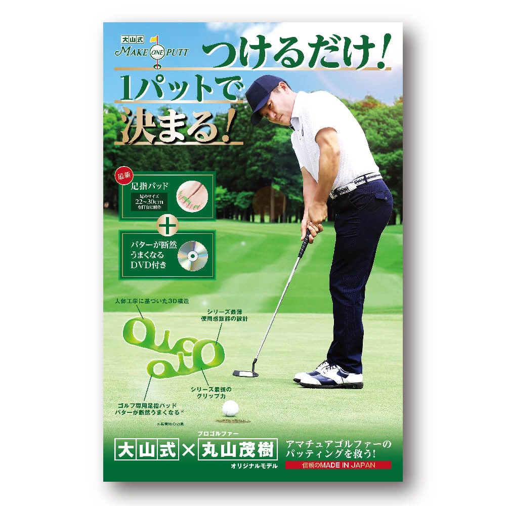 大山式×プロゴルファー丸山茂樹 大山式シリーズからゴルフ専用の丸山茂樹モデルが誕生! パターが断然うまくなる! 丸山茂樹プロの 45 分レッスンDVD付き ■商品名:大山式メイクワンパット ■硬度:15(中) ■足のサイズ:22cm~30cmに対応(男女兼用) ■材質:クリスタルゲル®(日本製)