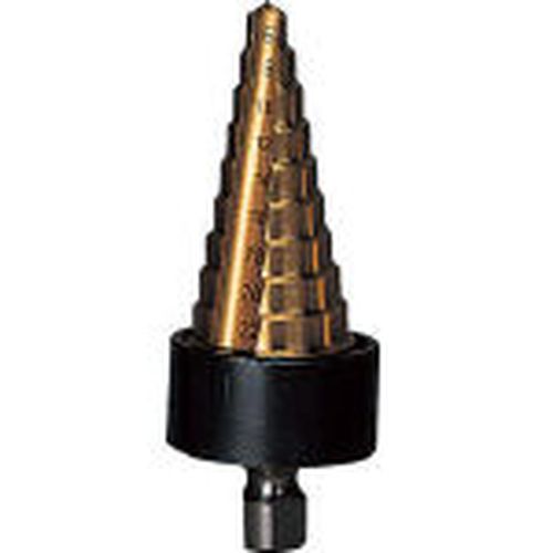 先端シンニング付ですので軽い食い付きで、ポイントずれがありません。 段幅(mm):4。段数(段):10。シャンク径(mm):10。穴あけ寸法(φ):6、8、10、12、14、16、18、20、22、24(安心ストッパー付)。表面処理:チタンコーティング。 使用用途を守ってご使用ください。日時指定はお受けできません。コバルト及び無機化合...