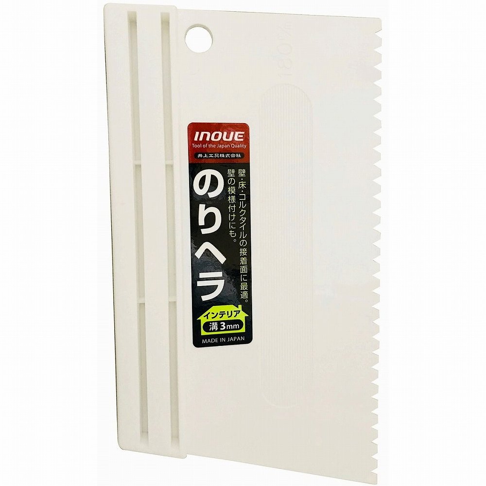 INOUE のりヘラ 180mm 溝3mm 滑り止め付 JAN:4530545005179 メーカー:井上工具(株) / ブランド:INOUE / 原産国:日本 特長 ●クロス壁やふすま・コルクタイル等の接着作業に最適です。●ヘラ先のギザ部分で一定の厚みで塗り付けができます。 用途 ●各種接着剤塗布作業に。 仕様 ●全長(mm):100●刃幅(mm):150●刃...