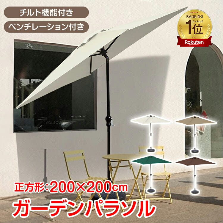 ■太陽の角度に合わせて傘の角度を調整できるチルト機能付き ■ベンチレーション付きで風通しが良く、強い風でも倒れにくい ■パラソルの形状は正方形 ■テーブルやチェアをしっかりカバーする広々200cmの傘幅 ■安定感があり、大人数でも使いやすい ■カラーバリエーション豊富で庭やテラスにマッチ 【商品内容】:ガーデンパ...