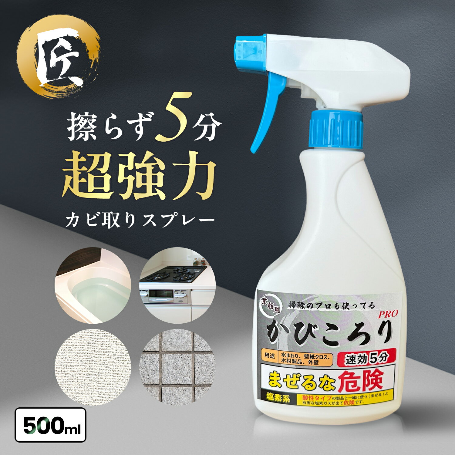 リニューアル 5分で取れる カビ取りスプレー500ml カビ取り剤 カビ取り 超強力 目地カビ プロ仕様 手袋2枚 マスク 風呂 バス 浴槽 浴室 キッチン ゴムパッキン コーキング タイル目地 木材 壁紙クロス 外壁 かびころり 送料無料 革新的 プロも愛用、5分で取れるカビ取り剤! 商品情報頑固でとれにくいお風呂のカビを手...