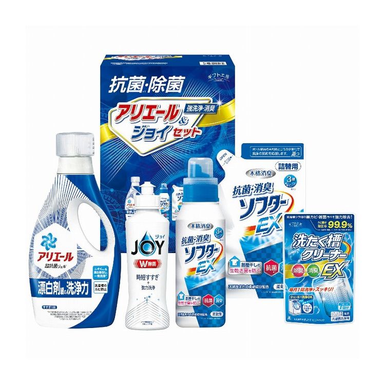 【商品特徴】抗菌力に優れたアリエールに本格消臭の抗菌・消臭柔軟剤とW除菌の食器洗い洗剤ジョイをセットしました。【製造者】シキシマ【箱サイズ(cm)】19.8×12×27.5cm【現品サイズ・内容】720gアリエールジェル・350g抗菌消臭ソフターEX・170ml除菌ジョイ各1本・350g抗菌消臭ソフターEX(詰替用)・100g洗たく槽クリー...