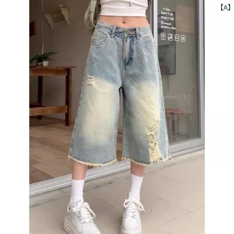 デニム レディース 7分丈 ダメージ加工 ワイドレッグ ハイウエスト ストレー...