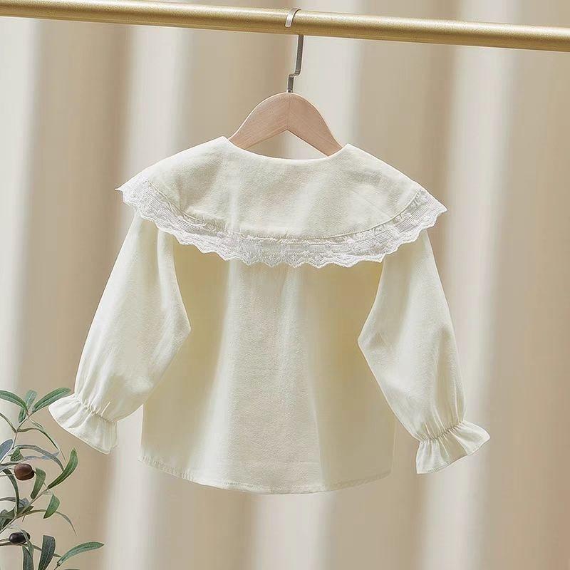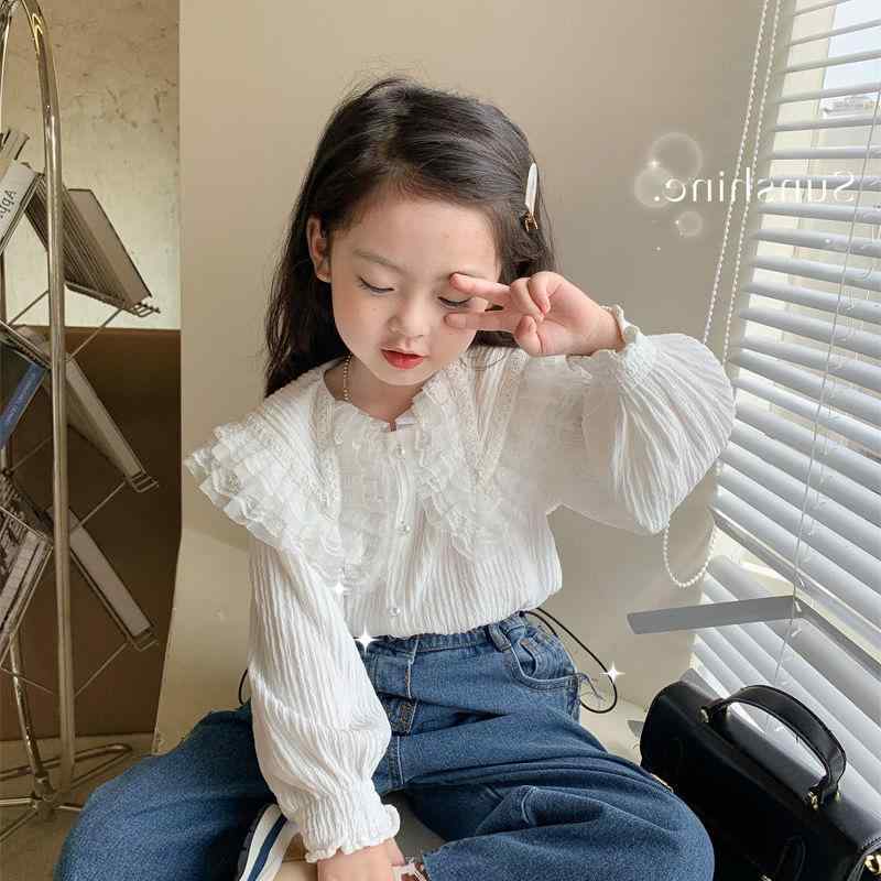 ・対象性別: 女児・対象年齢: 中小児(3~8歳、100~140cm)・画像: 実写モデルあり・スタイル: 清新・襟の形: 二重襟・生地加工: 柔らか обработка・袖丈: 長袖・柄: 無地・主な生地の組成: ポリエステル繊維(ポリエステル)97%・安全レベル: B類・色: 白いレースの襟付きシャツ・推奨身長:・タグ90: 90cm・タグ100: 1...