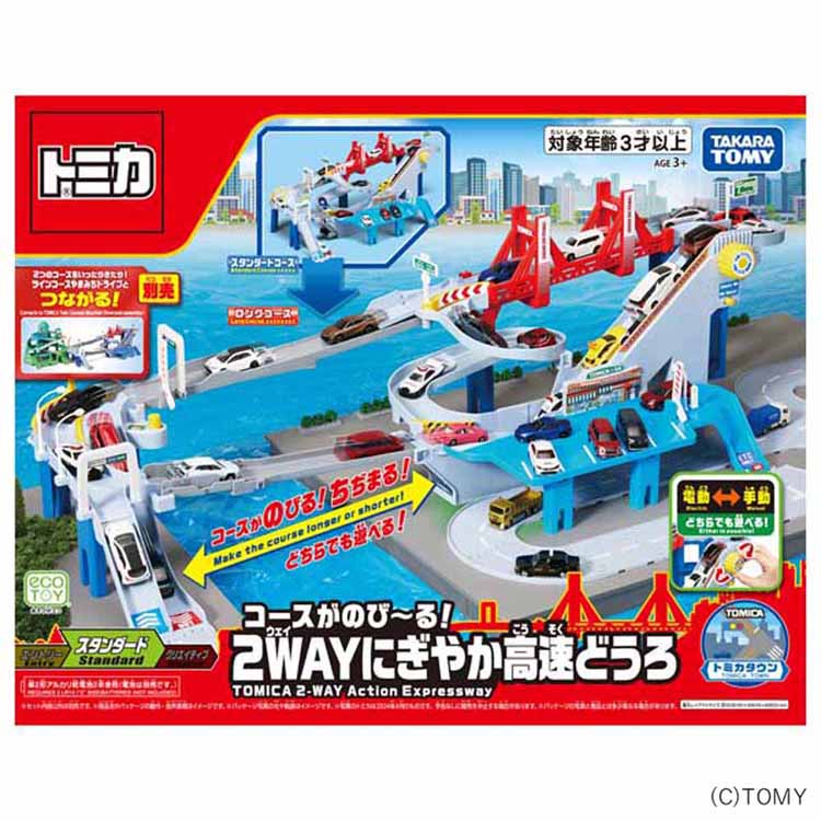 かんたん変形でコースがのびる!ちぢまる!たくさんのトミカがびゅんびゅん走る高速どうろ!トミカの台数に合わせてコースをのばしたり、ちぢめたり、コースを引き出すだけでかんたんに変形ができます。ビッグブリッジ、サービスエリア、ETCなど遊びがいっぱいの高速どうろをトミカがびゅんびゅん走行します。スパイラル...