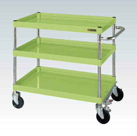 ●ボルトレスで組立簡単。棚板を逆さにするだけで、皿型・フラット型と組み替えることができます。安価で耐久性に優れるゴム車を採用。ワンタッチでワゴンを止めるフロアストッパー付です。●外寸:W750×D500×H740mm●均等耐荷重:150kg●本体色:グリーン●質量:23kg●キャスター:100φゴム車●段数:3●支柱:クロムメッキ25....
