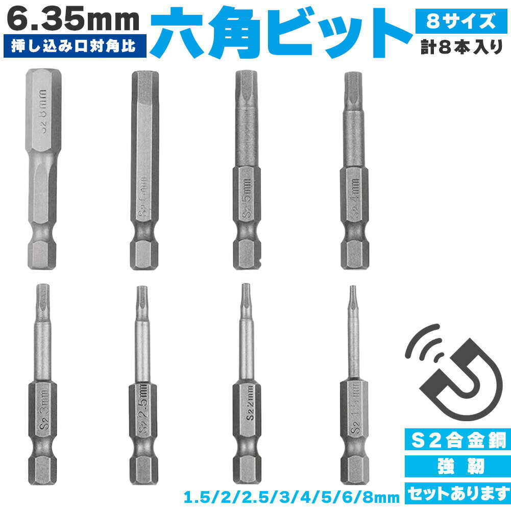 8ピース 6.35mm 六角ビット8サイズセット ドライバービット 8サイズ 磁気 六...