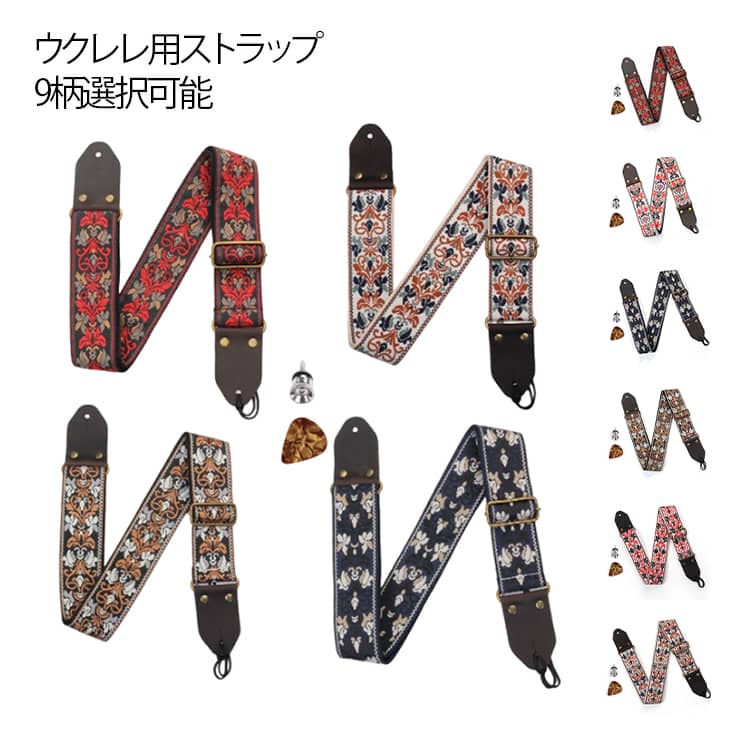 ウクレレ用ストラップ紐+ピック+ストラップピン付属9柄選択可能長さ80~35cm調整可能 幅5cm【抜群の安定性で演奏に集中できる肩掛け設計】 首掛けタイプと比較して、ウクレレの位置がぶれずにしっかり固定されます。立奏時や動きのあるパフォーマンス時にも楽器が安定し、より演奏に没頭できる環境を提供します。長時間...