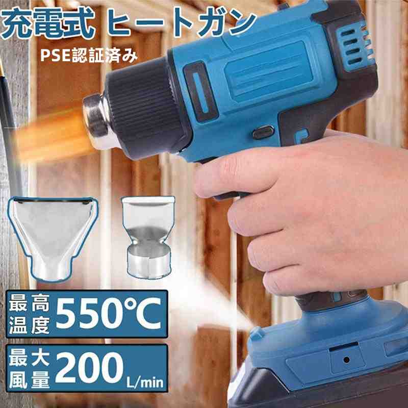 ■商品説明: 550℃の熱風を吹き出して様々な用途に使用可能な充電式ヒートガンです。 作業用途によって、使い分けられる2種類のノズルを付属しています。 コードレスの為、屋外やコンセントの位置が遠い箇所でも、場所を選ばずに使用できます。 トリガーと上部セーフティボタンを同時に押さないと始動しない誤作動防止機...