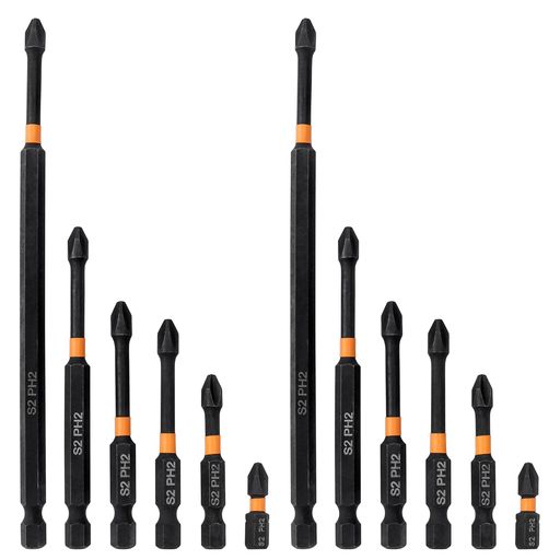 12本プラスドライバービット:軸径:6.35mm六角軸(1/4インチ)。全長:150mm、90mm、70mm、65mm、50mm、25mm。強力な磁気吸着、を吸うことができネジとき簡単使用それ、滑りにくく、より便利です。吸着ネジで作業効率アップ。 S2材リン酸塩黒処理、リン酸塩処理により表面の耐酸化性、耐錆性、耐食性が向上。スーパーハード...