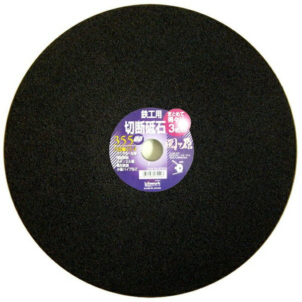■アングル・丸棒・チャンネル鋼・薄板鉄板・異形鉄筋・小径パイプなどの切断に。・外径: 355mm・厚さ: 2.8mm・穴径: 25.4mm・仕様: 1G・最高周速度: 3,800m/min・最高回転数: 3,400rpm・砥粒/粒度/硬度: A/#46/R・三枚入り
