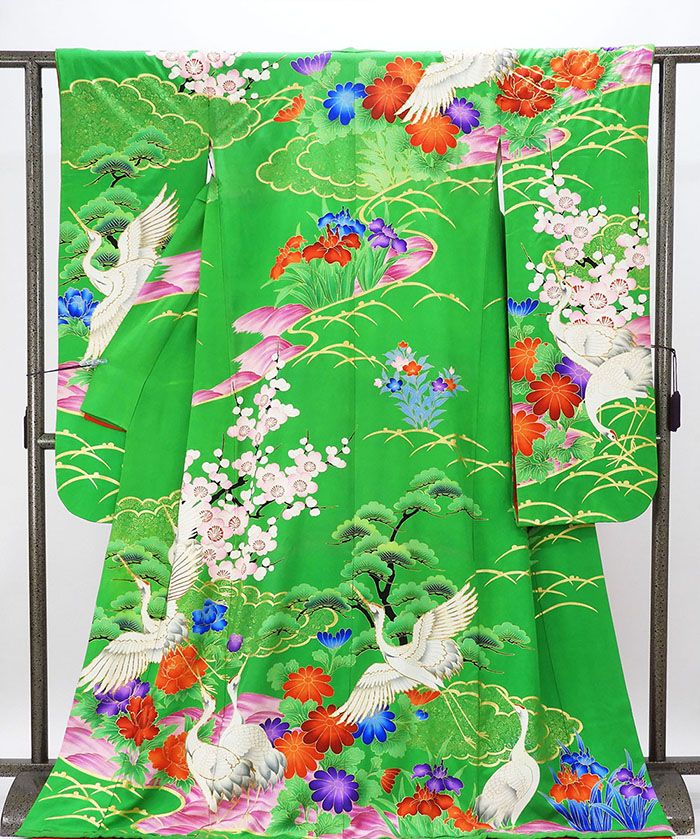 ■□■□■□■□■□■□■□■□■□■□■□■□ 【商品説明】 正絹・引振袖です。 緑色地に紫や朱赤・ブルーなどの多色や金箔・金駒で舞鶴四季花模様が柄付けされています。 衿や袖口・振リ・裾周りに赤色の比翼と表地と比翼の裾には薄めの綿が入っています。 引き振袖は未婚女性の正装とされる振袖の一種で、結婚式の花嫁衣装として着用され...