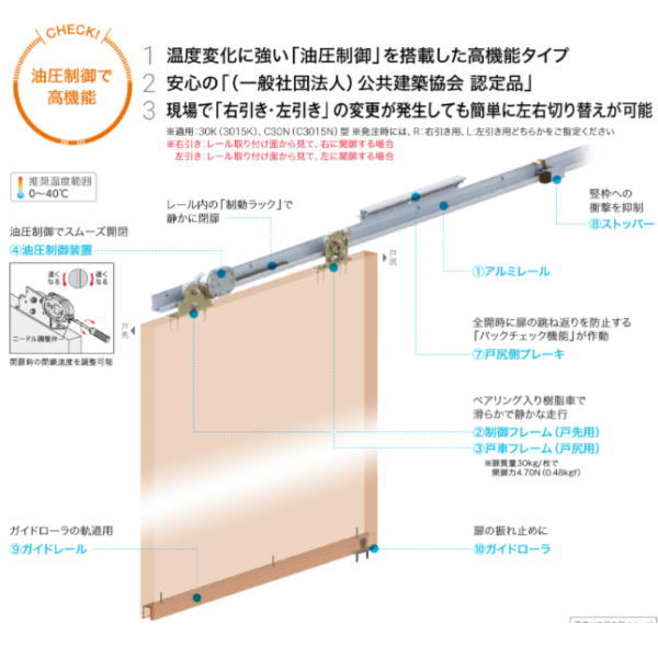 特長 戸尻側ブレーキにより扉を勢いよく開けた場合でも、衝撃をやわらげます。 木製引戸用 油圧制御装置の温度補償内蔵により0℃?40℃までスムーズに開閉します。 左右の切り替えが可能(施工性を考慮して出荷時は右引き用、左引き用をご用意しています) 適用範囲]扉質量 10kg〜30kg 対応扉幅 600〜1300mm 有効開口...