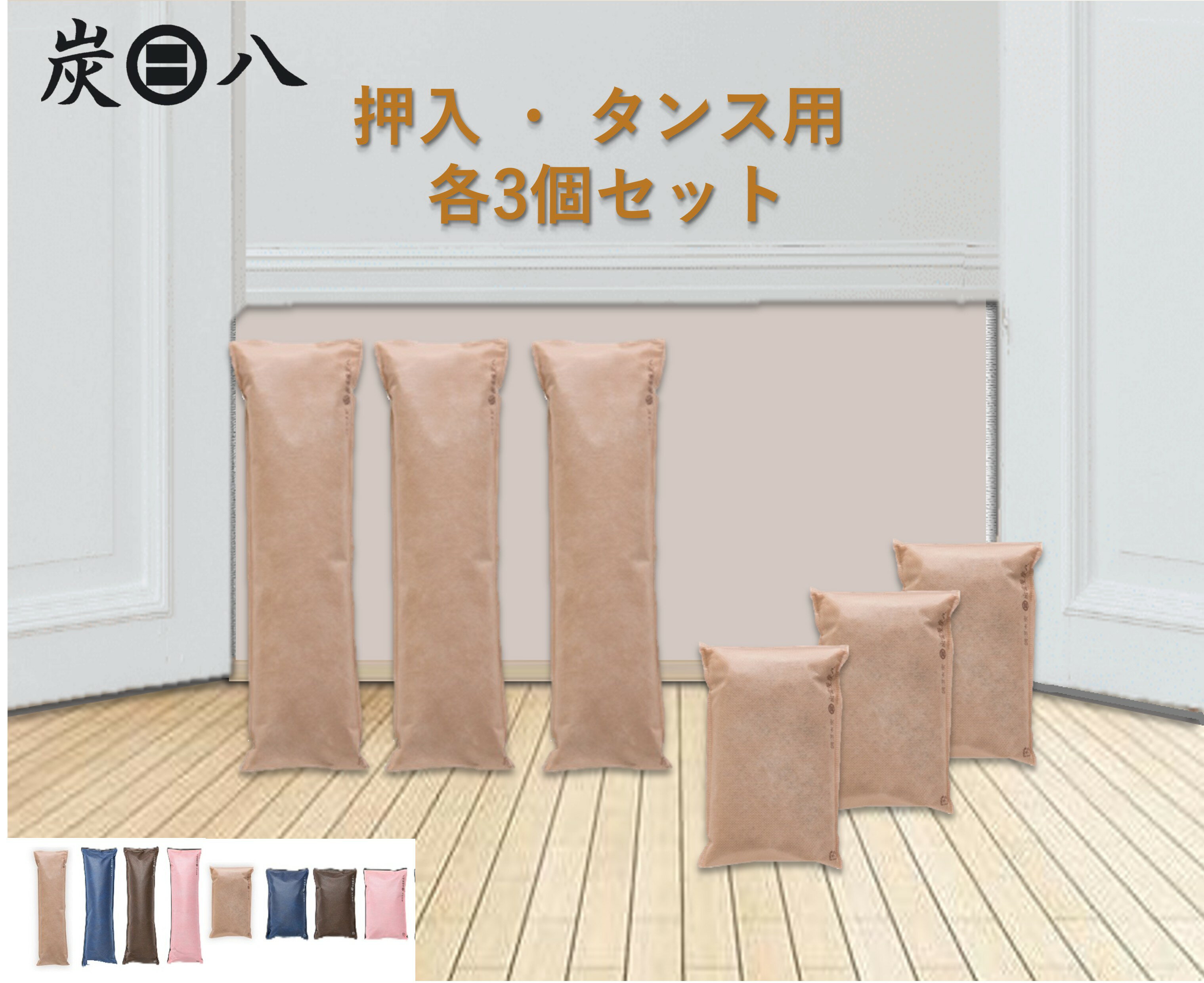 炭八のある生活を体験。 炭八の調湿力が、あなたの住まいを快適に 【セット内容】 炭八押入用×3個 炭八タンス用x3個 【商品サイズ】 炭八押入用:12cm×45cm 厚み約7cm 約300g/袋 炭八タンス用:12cm×22cm 厚み約5cm 約100g/袋 【カラー】 ベージュ/ネイビー/ブラウン/ピンク 【素材】 木炭(針葉樹) ※丈夫な不織...