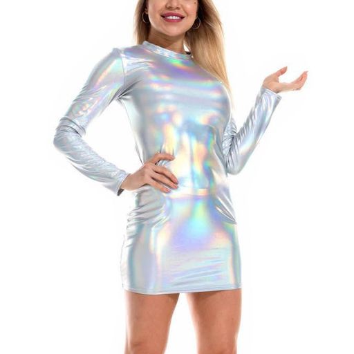 [LanBuff]レディース超光沢ワンピースタイトドレスオールスルー長袖ラウンド...